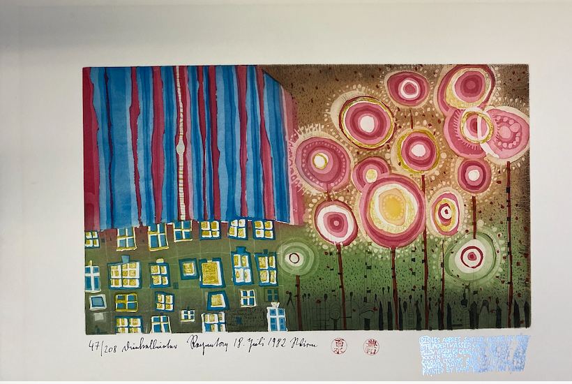 Aus dem Gespräch 2019 mit Herrn Hellstern ergab sich, dass pro Motiv "Hundertwasser Regentag" ca. 800-1000 Exemplare gedruckt worden sind. Wir haben die gesamte Rest-Auflage gekauft.
