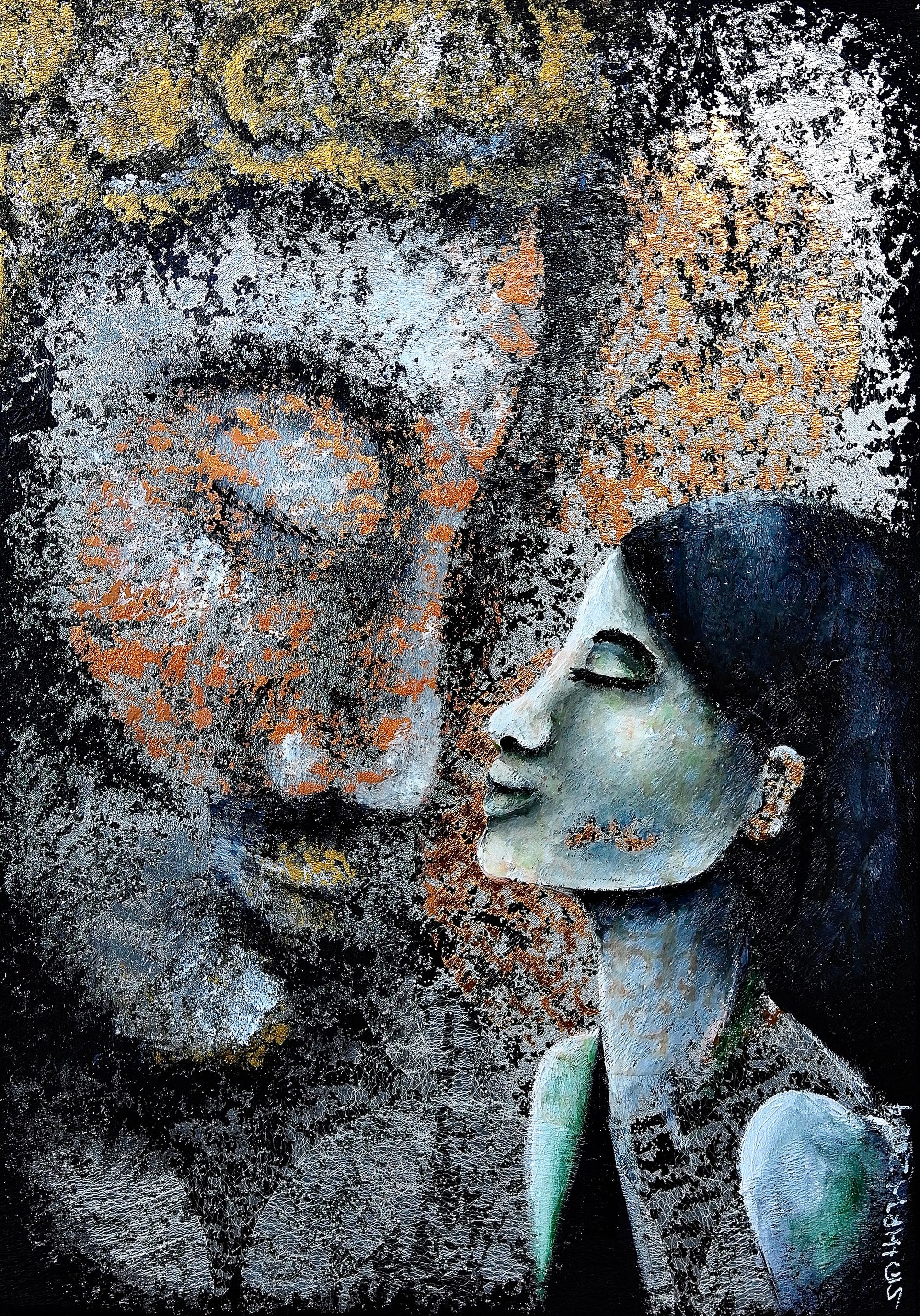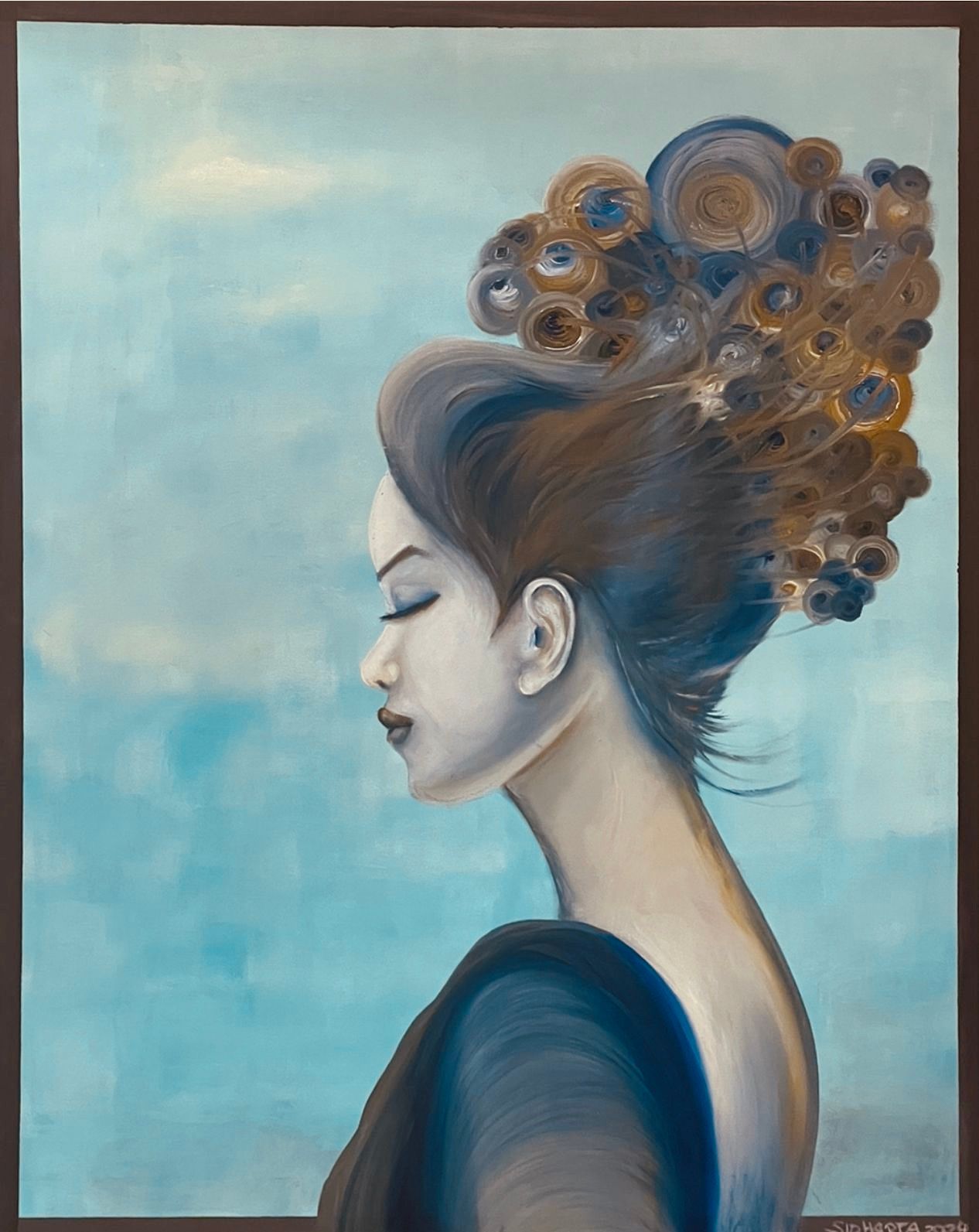 Manchmal schreibt sie ums Bild, oder ins Bild, ihre poetischen Gedanken, wie das Kunstwerk entstanden ist. Dieses Halbporträt zeigt die Melancholie eines Frauenbildnis, drückt das Erstauen aus, auf eine wunderbare Art und Weise.