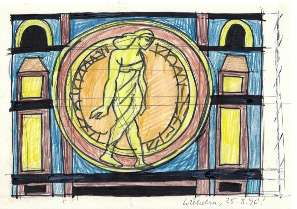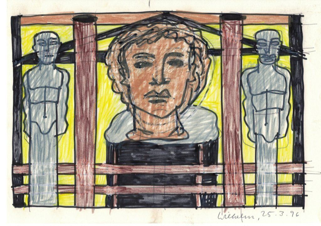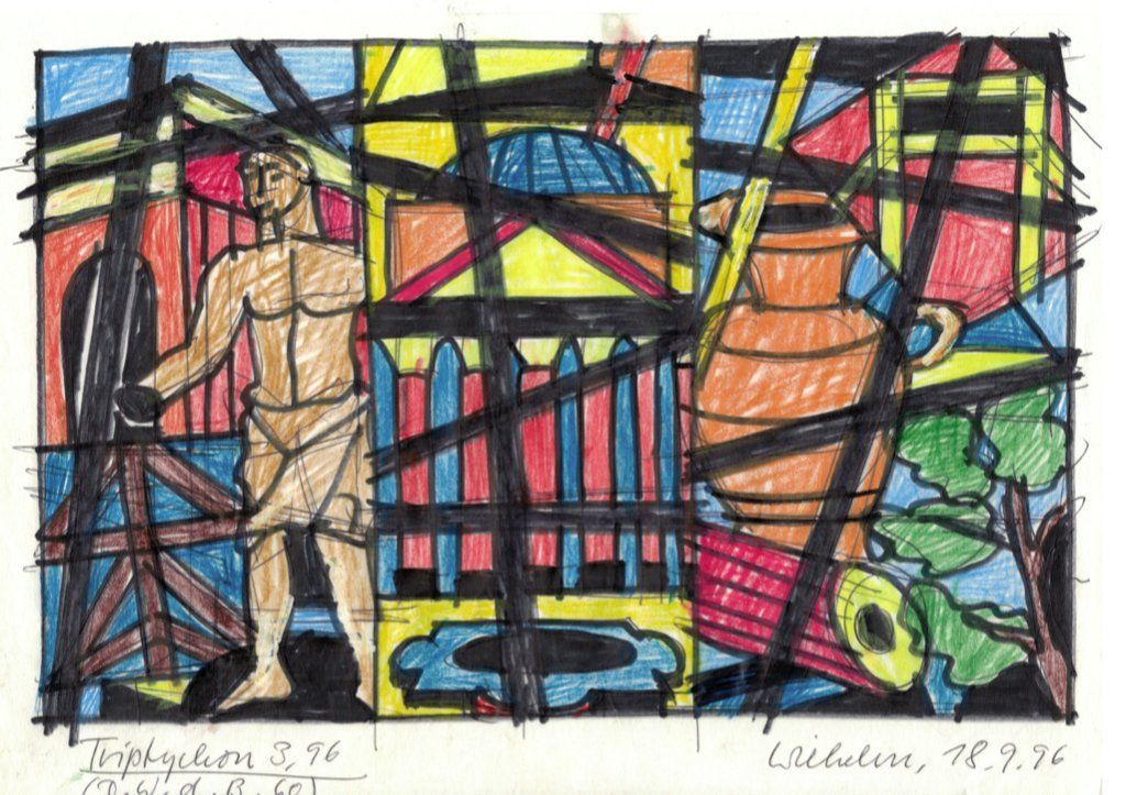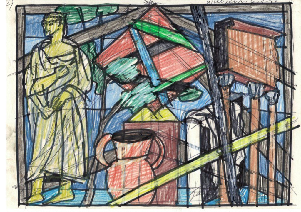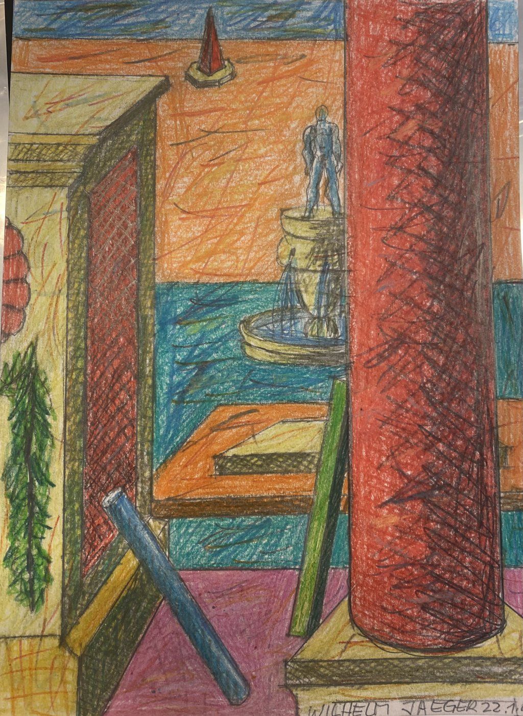 Der Künstler war ca. 4 Wochen in Italien in den Marken, ich meine September/Oktober 1991 und 1995, bei Bekannten. Wilhelm Jaeger war begeistert von den Menschen und den wildromantischen Landschaften. Am 1. Januar 1996 begann der Künstler mit einem Zyklus von Zeichnungen, "Die Werkstatt des Bildhauers", teilweise ausgehend von dem, was er in den Marken gesehen hat, vermischt mit seinen Fantasien von der Italienischen und Griechischen Antike. Er gestaltete diese Zeichnungen spontan aus dem Bauch heraus, es entstanden ca. 100 Arbeiten bis in den Spätsommer. Ende August 96 zeigte mir Wilhelm Jaeger diese wunderschönen, hervorragenden Farb-Zeichnungen, ich war sehr begeistert. Ein großer Teil dieser Serie gehört der Galerie. Man kann diese Unikate ab 700.00CHF erwerben.