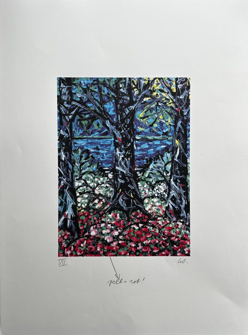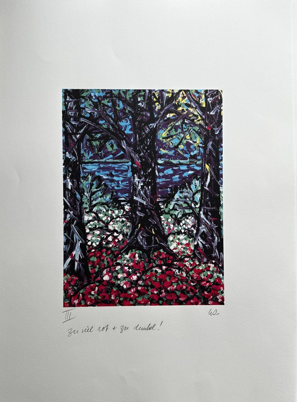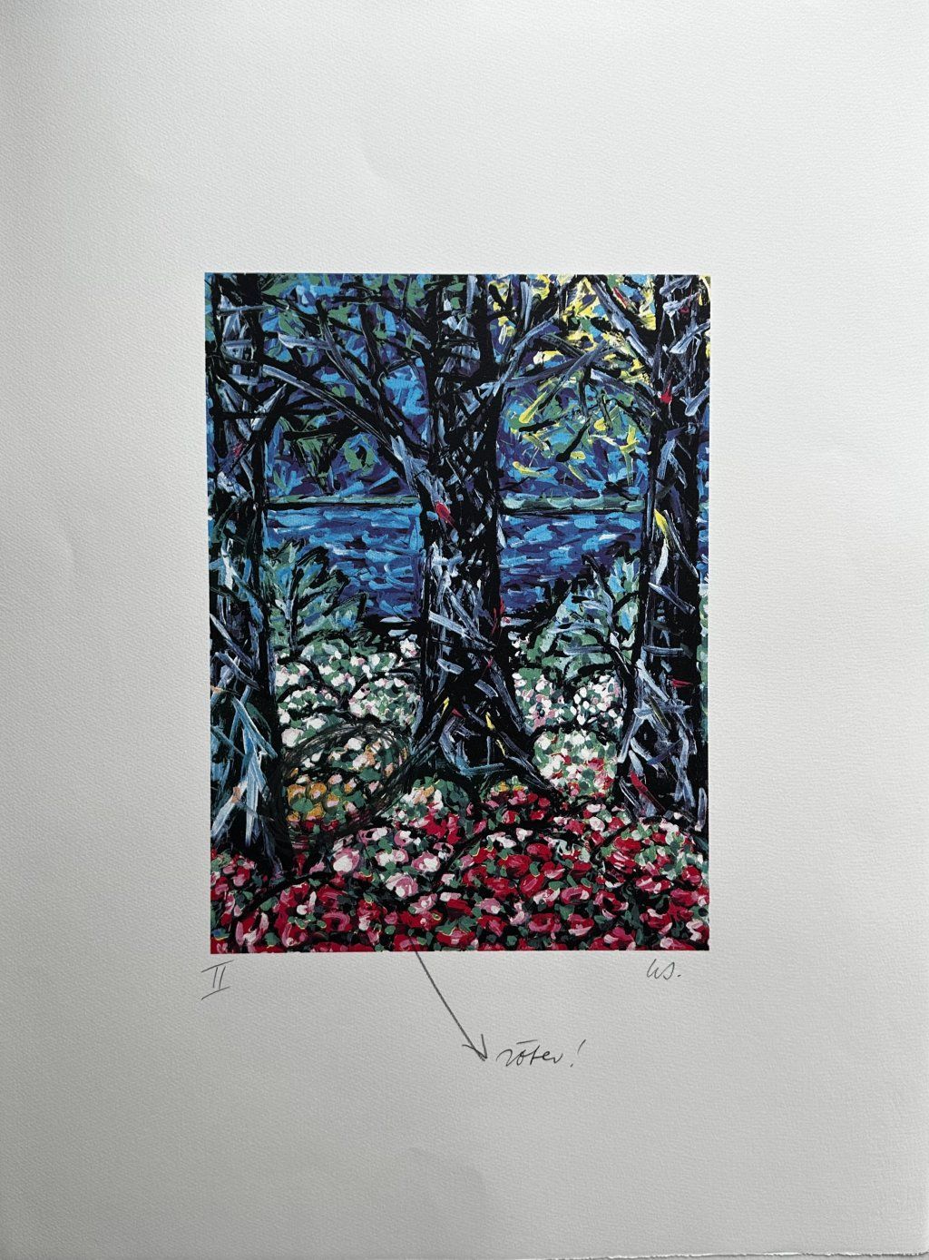 Die handkolorierte Grafik war in Ausstelungen bei René Bernhard, Kunsthaus Allgäu und Galerie Matzner. Bis heute wurden um die 50 Arbeiten verkauft. Wir haben noch einen kleinen Teil der Auflage. Für diese Grafik gab es einen kleinen Verkaufskatalog, welcher bereits vergiffen ist.