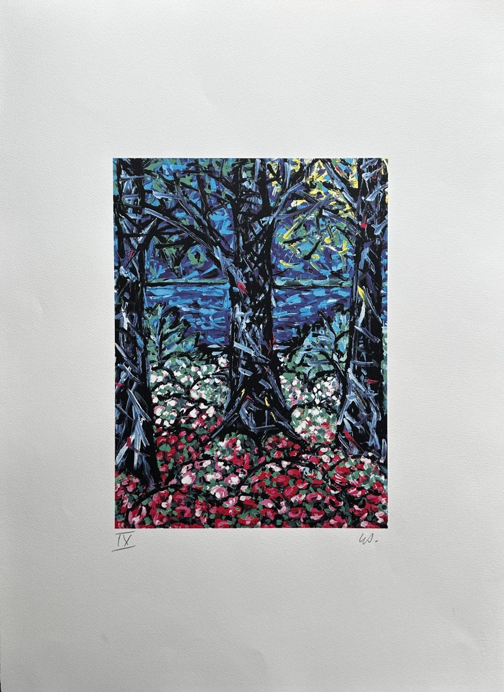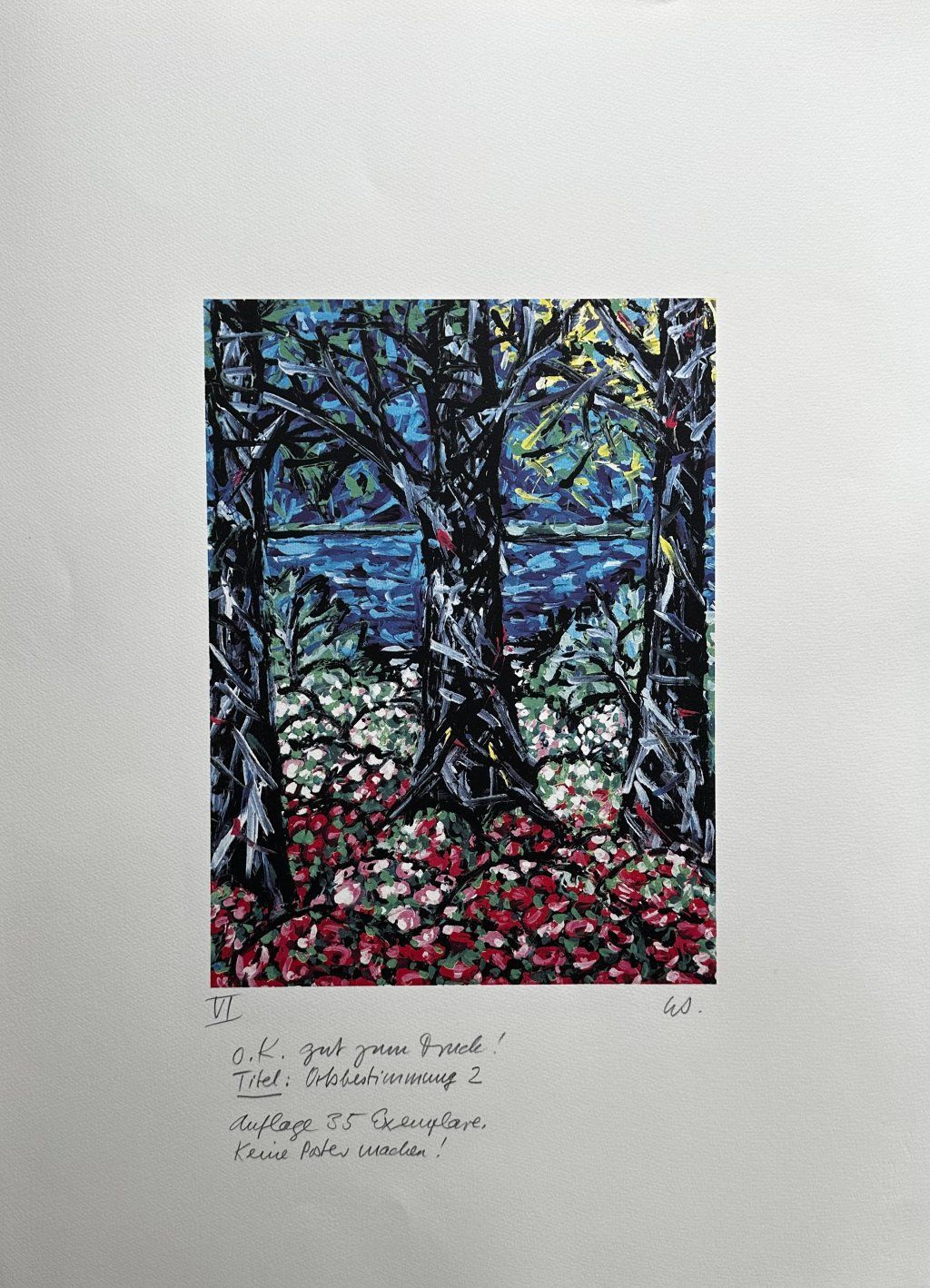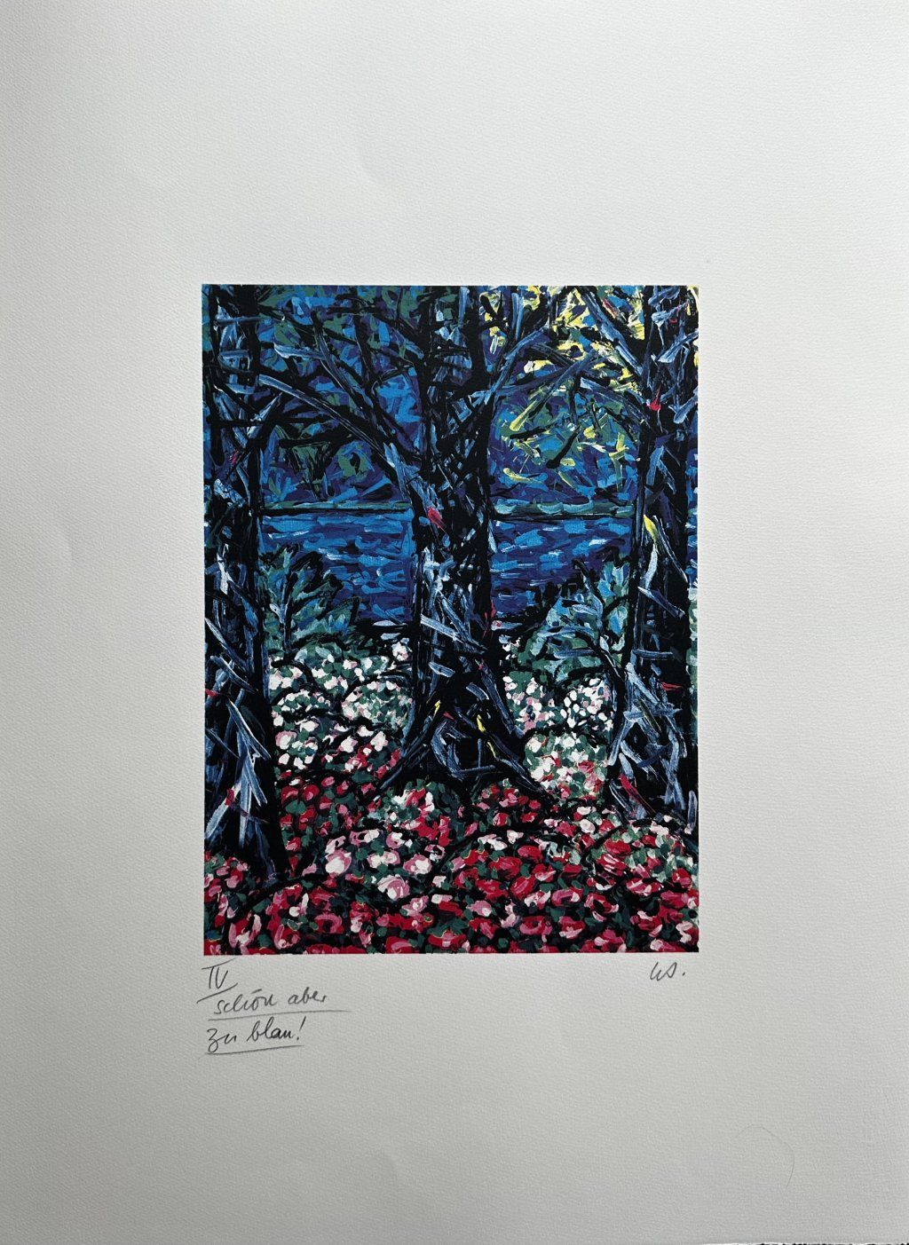 Die handkolorierte Grafik war in Ausstelungen bei René Bernhard, Kunsthaus Allgäu und Galerie Matzner. Bis heute wurden um die 50 Arbeiten verkauft. Wir haben noch einen kleinen Teil der Auflage. Für diese Grafik gab es einen kleinen Verkaufskatalog, welcher bereits vergiffen ist.